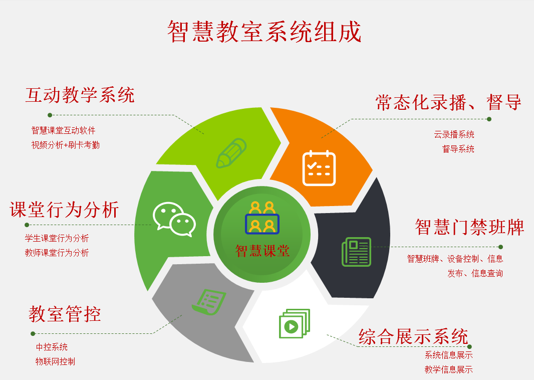 教學資産智能(néng)管控,教學環境智慧感知(zhī),教學過程互動參與,教學資源智慧制(zhì)作(zuò),教學系統智能(néng)呈現(xiàn),設備運維雲化(huà≈)管理(lǐ)